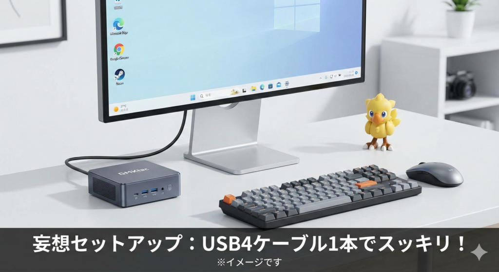 普段は手のひらサイズの省電力ミニPCとして使いつつ、本気で重いゲームやAI画像生成をやりたくなったら、**「ドッキング!フルパワー!」**でゲーミングPC並みの性能に変身させることができる…。