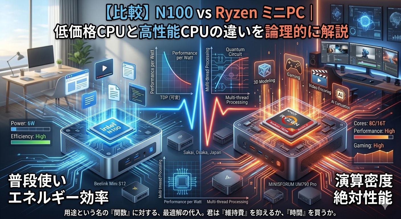 ミニPC選定における最大の分岐点は、Intel N100という「超省電力・高効率アーキテクチャ」を採るか、AMD Ryzenという「高密度・マルチスレッドアーキテクチャ」を採るかにある。
