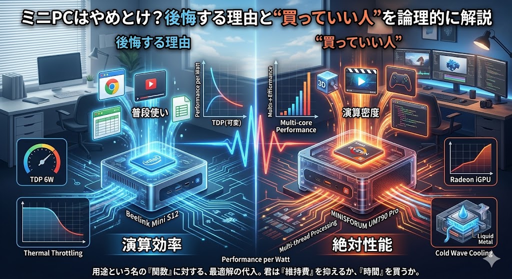 本記事では、スペック(演算能力)、構造(熱設計・拡張性)、用途(負荷特性)という3つの物理的観点から、ミニPCが「やめとけ」と工学的に定義される理由と、それでも選定すべき「合理的理由」を論理的に体系化する。